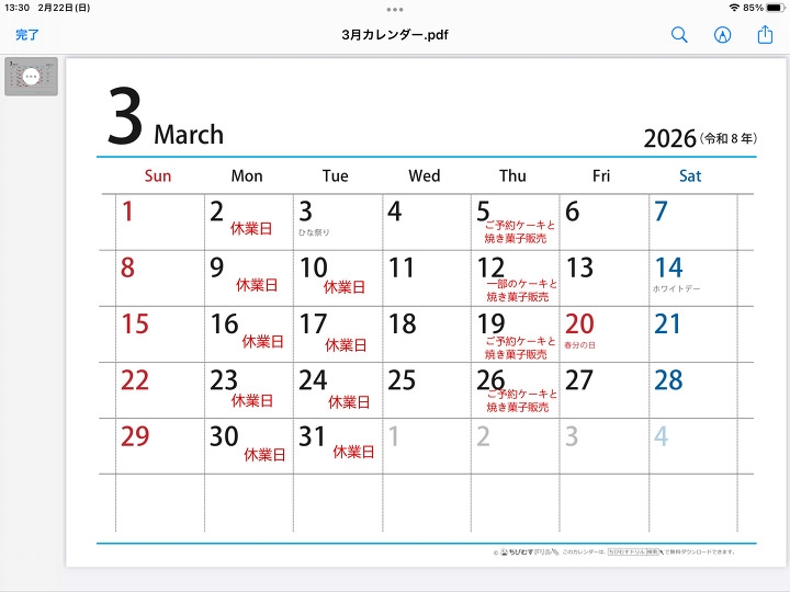 3月休業日(2026.02.22)