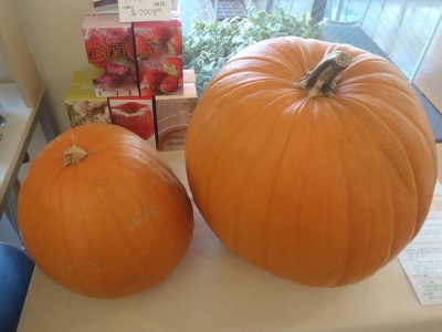 お店に大きなかぼちゃが2個登場しました!今年初めてかぼちゃの重さあてクイズをします。2個合せて何キロでしょう??