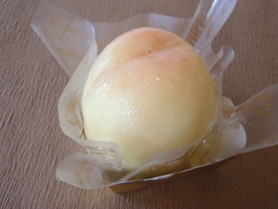桃を1個まるごとつかったケーキです。種をくりぬいた桃の中には、おいしいカスタードクリームがいっぱい!!