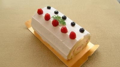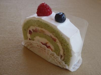 ピスタチオのふわふわスポンジにフルーツがいっぱいです。