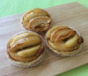 バターでソテーした紅玉をアーモンドクリームをしいたパイ生地にのせじっくりとオーブンで焼きました。紅玉が甘酸っぱく、とってもおいしいこの時期人気のお菓子です。