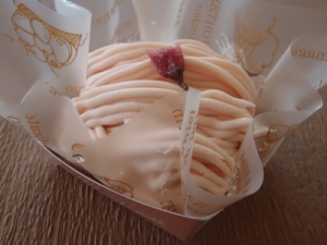 クレヨンのショーケースには、春を感じるピンクのかわいい「桜のモンブラン」が並びました!ほんのり桜が香るクリームにシロップ漬けのお花を乗せ、中は、栗と生クリームです。春を感じる一品です。