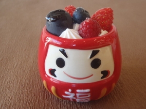 真っ赤な陶器のだるまに入ったプリンアラモード、年末年始の集まりや大掃除の合間のおやつにいかがでしょうか?インパクトあります!!