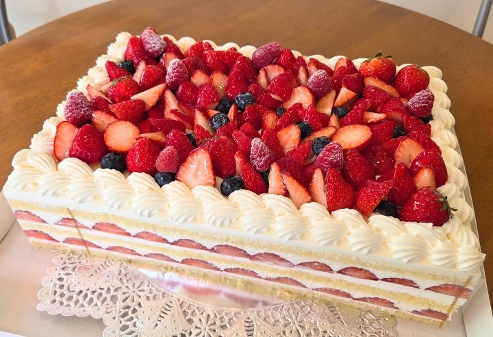 30㎝×20㎝の大きいケーキにフルーツをいっぱいデコレーションしました。
