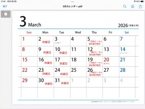 3月の休業日です。